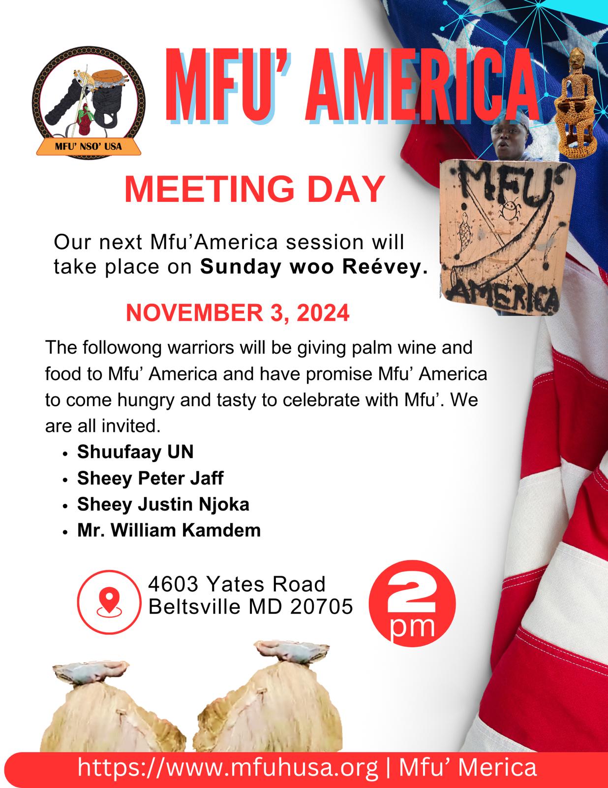 The Mfu' Nso' USA session for Sunday November 6, 2022, will be hosted by Taa Woo Buu, Mr. Chris Mbu...
